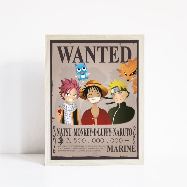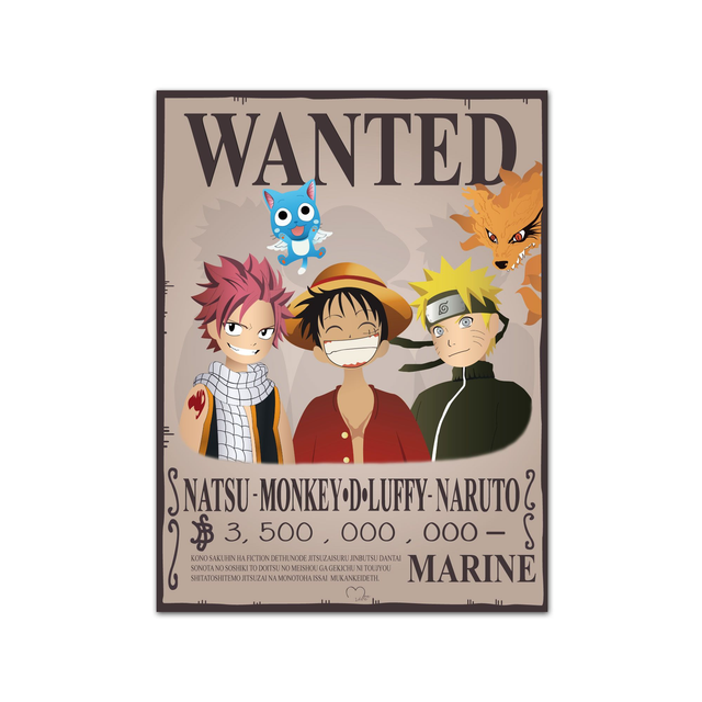 Reprise de la fameuse affiche WANTED de One Piece, je vous propose cette affiche mixant 3 mangas,