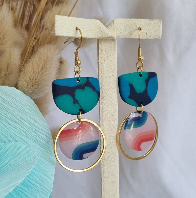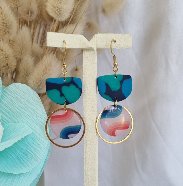 Boucles d'oreilles fantaisies en résine, pate polymère et acier inoxydable.
