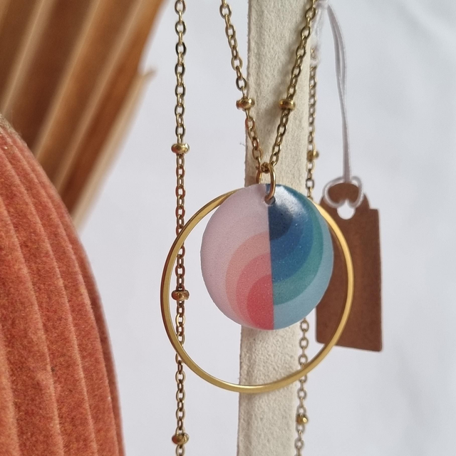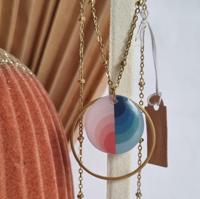 Collier composé d'une illustration résinée. Taille 2cm de longueur et 'un anneau en acier inoxydable doré de 3cm, vendu avec une chaine en acier inoxydable.